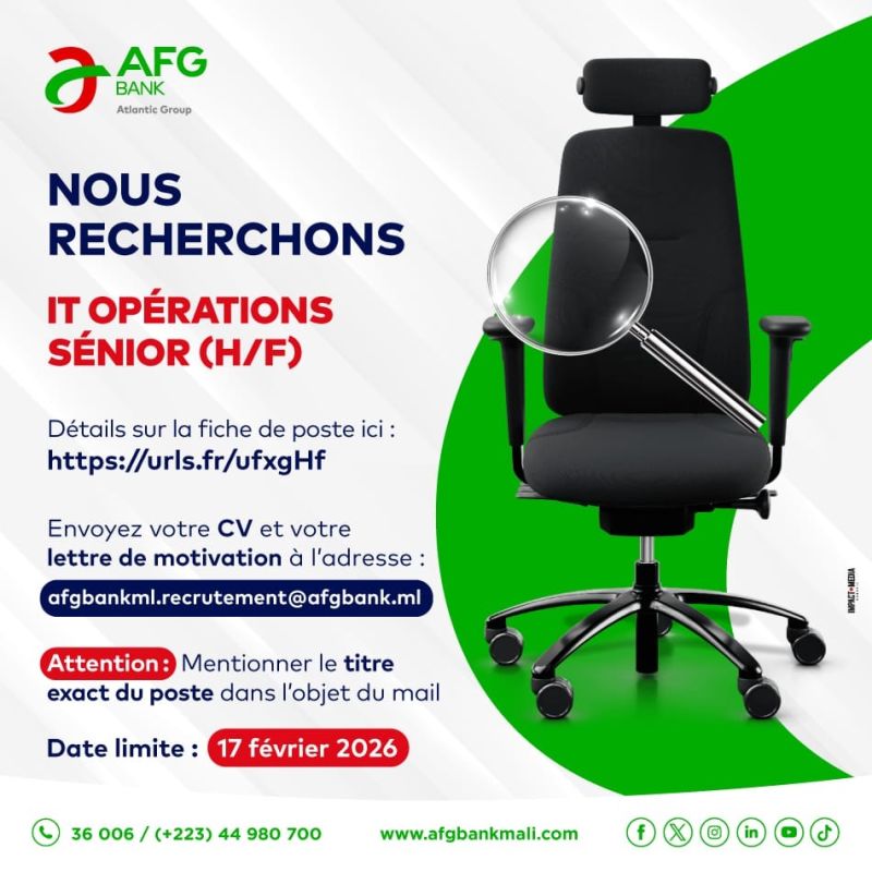 ➡️ Envoyez votre CV et lettre de motivation et mentionner le titre exact du poste dans l’objet du mail à : afgbankml.recrutement@afgbank.ml