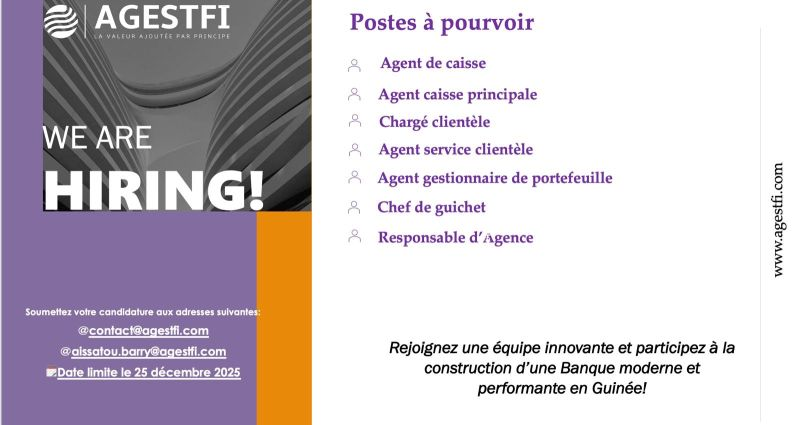 Profil : Bac+3 (Finance, Gestion, Commerce) + 2 ans d’expérience, maîtrise du français et anglais, produits bancaires et suivi portefeuille.