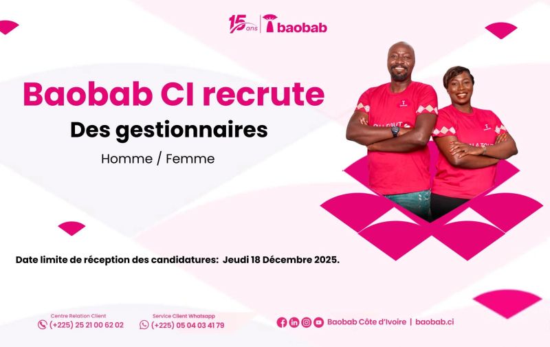 Baobab Côte d’Ivoire recrute pour le poste de 𝐆𝐄𝐒𝐓𝐈𝐎𝐍𝐍𝐀𝐈𝐑𝐄 (Homme /Femme).