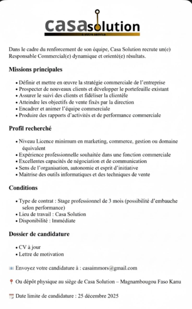 Dans le cadre du renforcement de son équipe, Casa Solution recrute un(e)