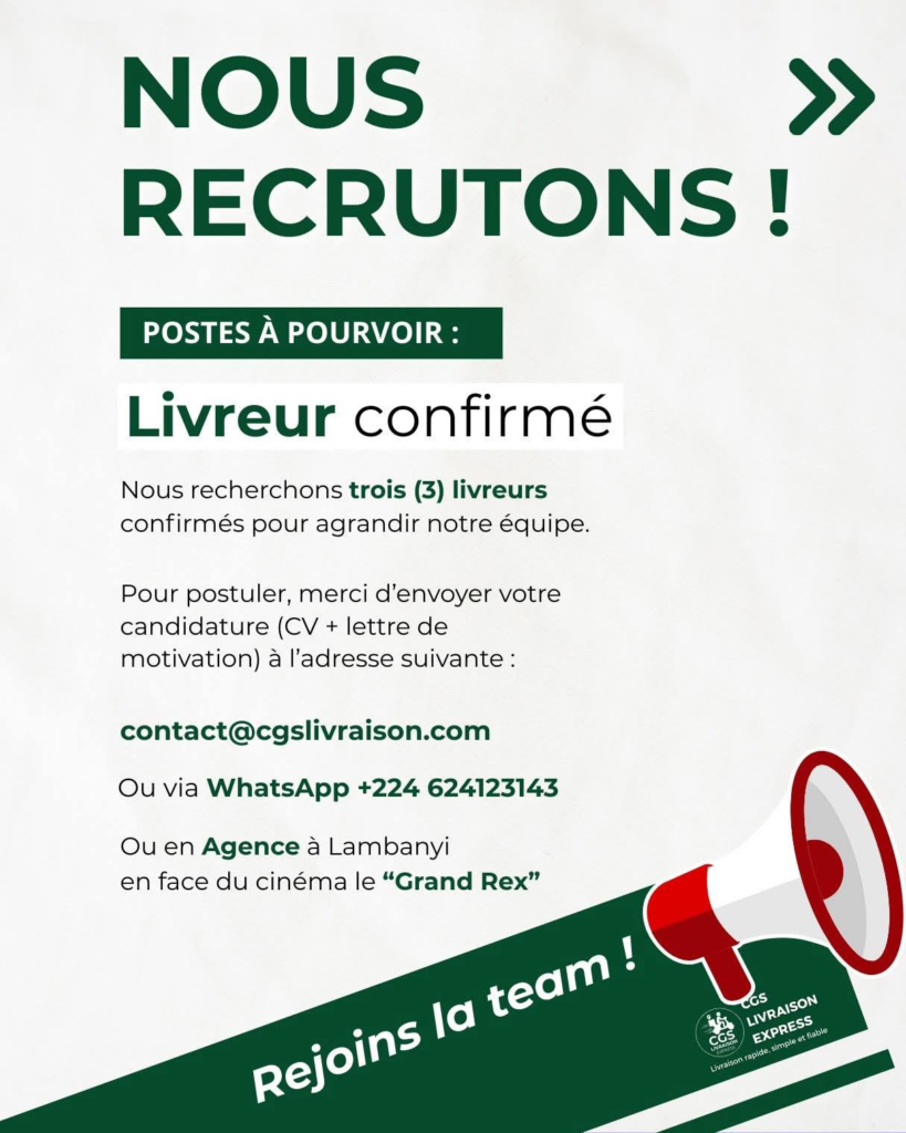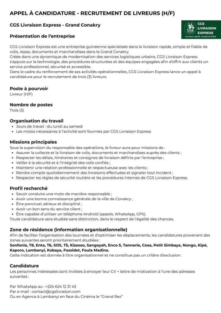 Dans le cadre du renforcement de ses activitĂ©s opĂ©rationnelles, CGS Livraison Express lance un appel Ă