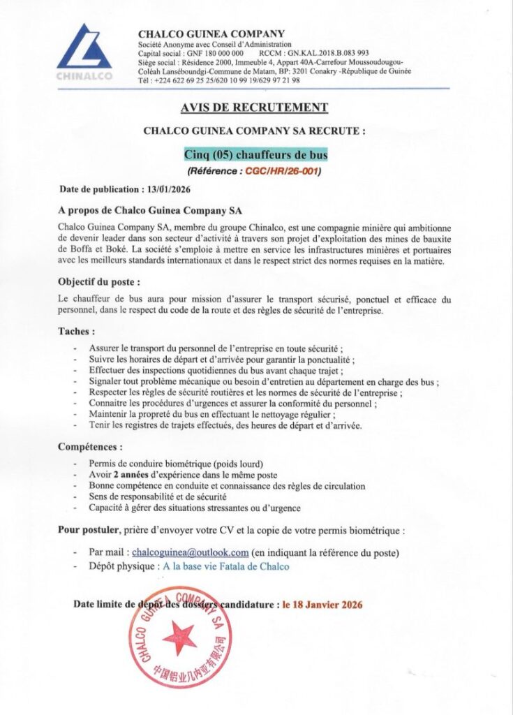 CHALCO GUINEA COMPANY SA RECRUTE: