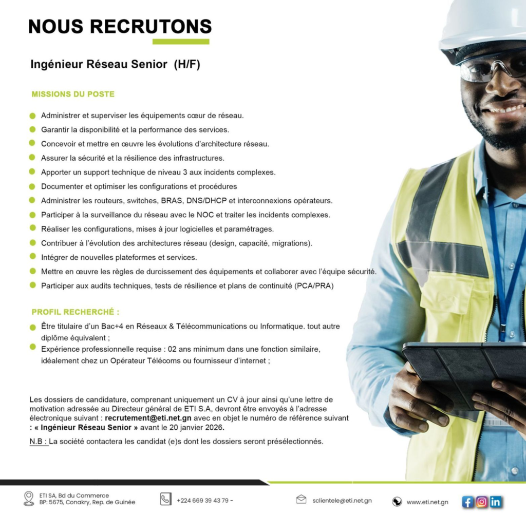 Envoyer nous votre candidature (n’oubliez pas préciser en objet l’intitulé du poste) à l’adresse: recrutement@eti.net.gn avant le 20 janvier 2026.