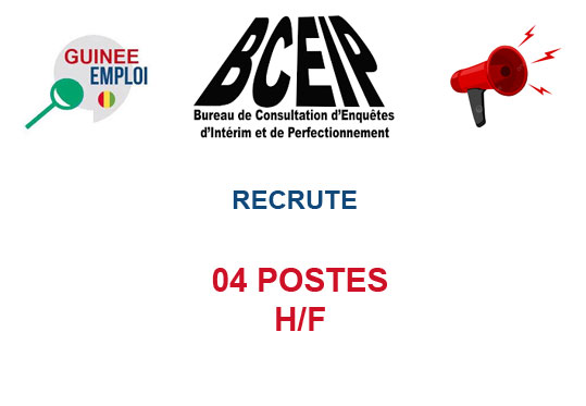 Pour postuler : Les dossiers de candidature (CV et lettre de motivation) sont déposés aux bureaux de BCEIP de Kamsar (En Face de la Direction des Chemins de Fer CBG……) et de Sangarédi (derrière l’Eglise Catholique de la Cité Quartier DELFROD (628-240-836/669-526-277/621-422-415/), ou envoyez vos cv et lettres de motivation par courriel à l’adresse suivante : emploi@groupebceip.com