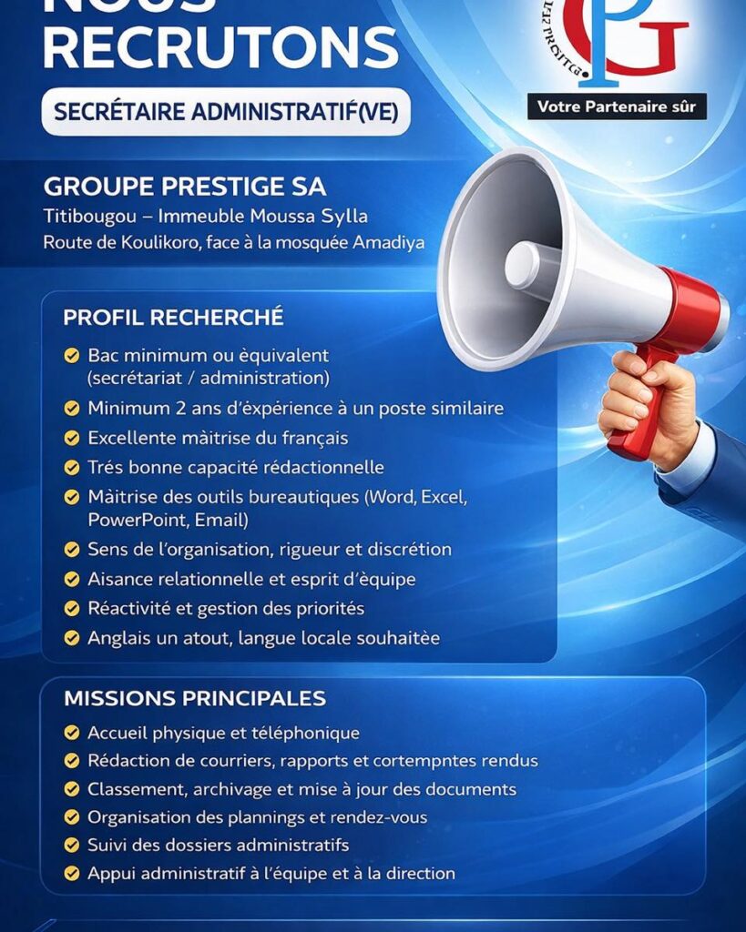 Le Groupe Prestige SA recrute un(e) Secrétaire Administratif(ve) pour renforcer son équipe.