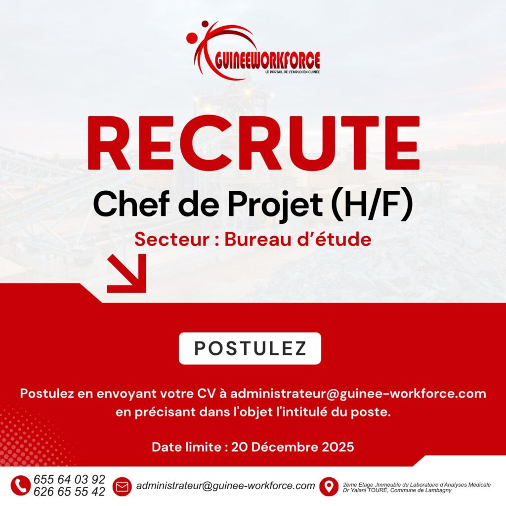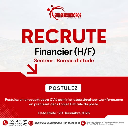 Pour postuler, envoyez votre CV à l’adresse : administrateur@guinee-workforce.com en précisant en objet l’intitulé du poste