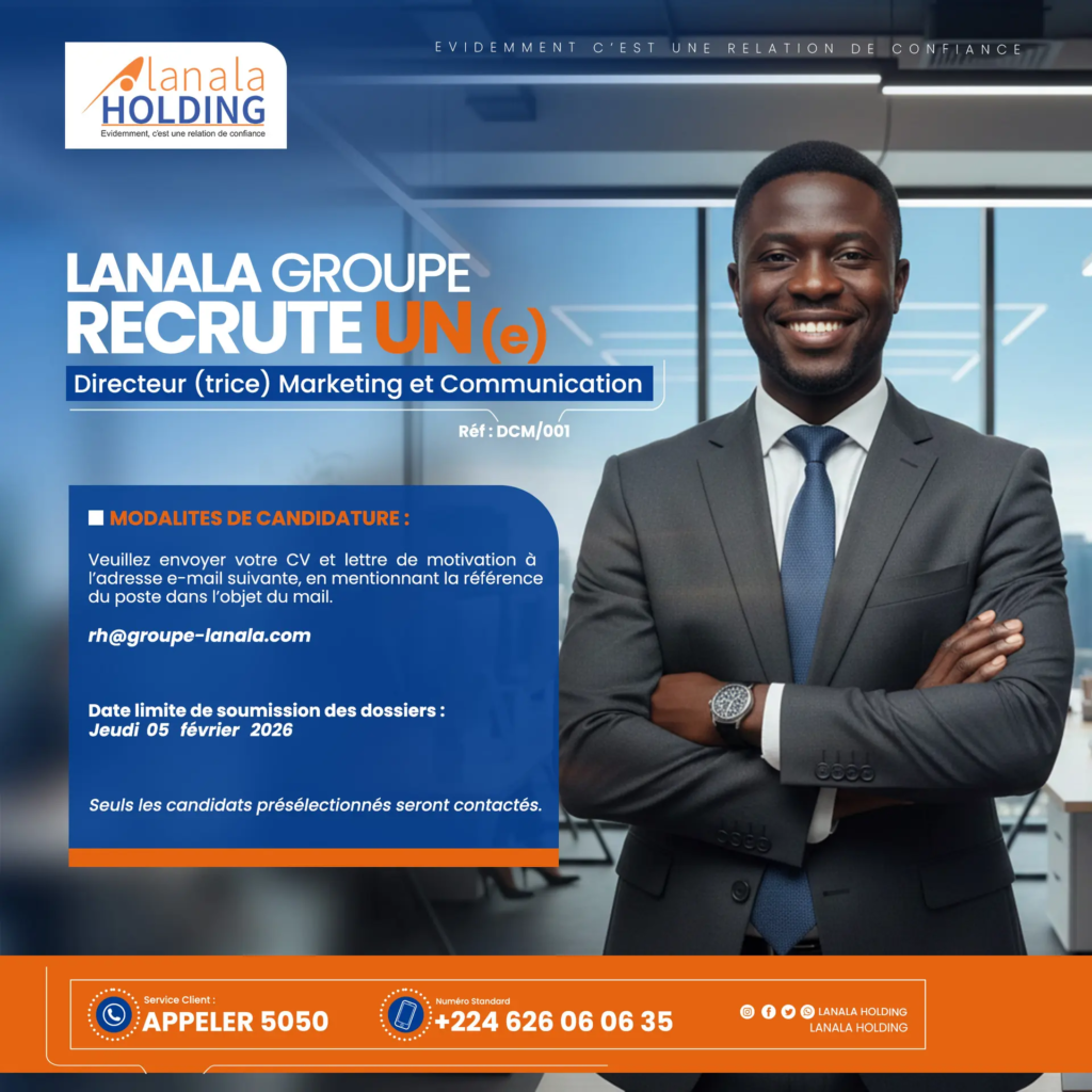 Dans le cadre du renforcement de ses équipes dirigeantes, le Groupe LANALA évoluant dans les secteurs des assurances, de la microfinance et des services financiers digitaux, recrute un (e) Directeur (trice) Marketing Communication & Groupe.