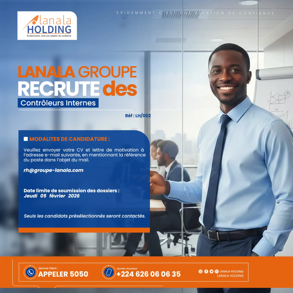 Dans le cadre du renforcement de ses équipes dirigeantes, le Groupe LANALA évoluant dans les secteurs des assurances, de la microfinance et des services financiers digitaux recrute des Contrôleurs Internes pour ses différentes entités.