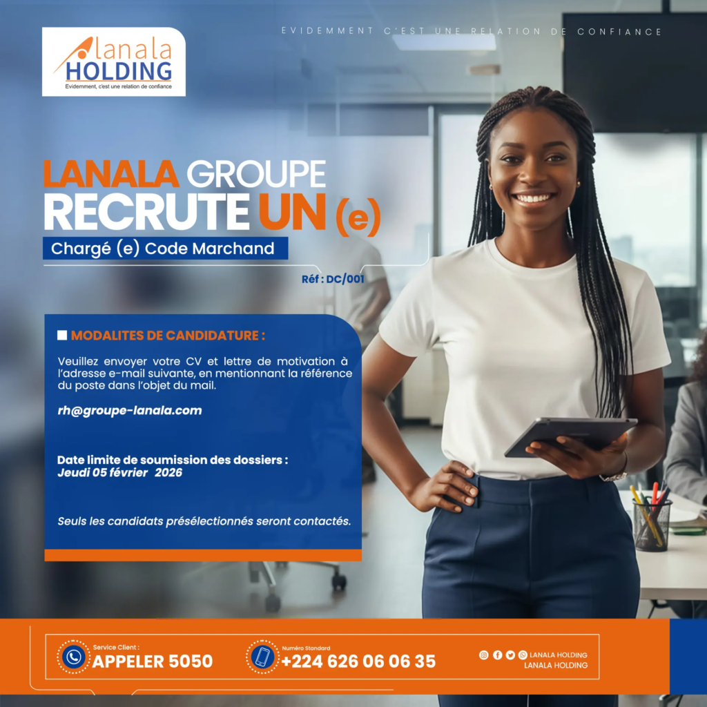 Dans le cadre du renforcement de ses équipes dirigeantes, le Groupe LANALA évoluant dans les secteurs des assurances, de la microfinance et des services financiers digitaux, recrute un (e) Chargé (e) Code Marchand pour son entité Digital Pay.