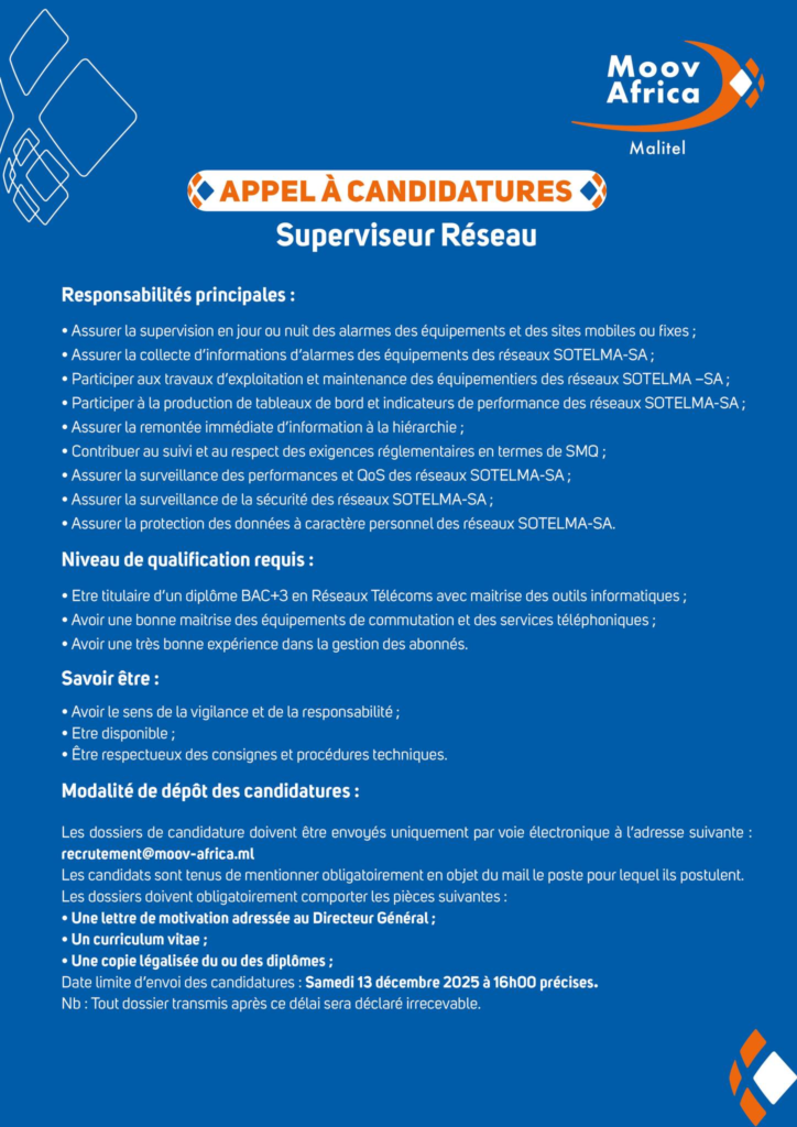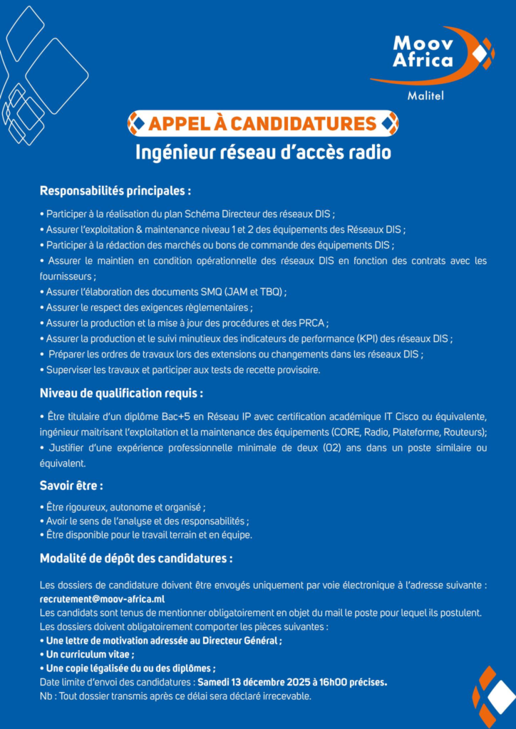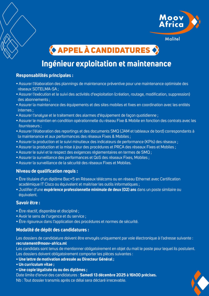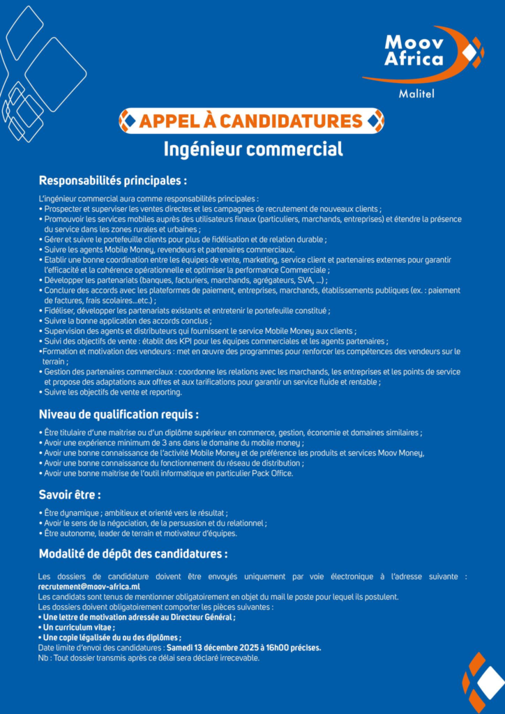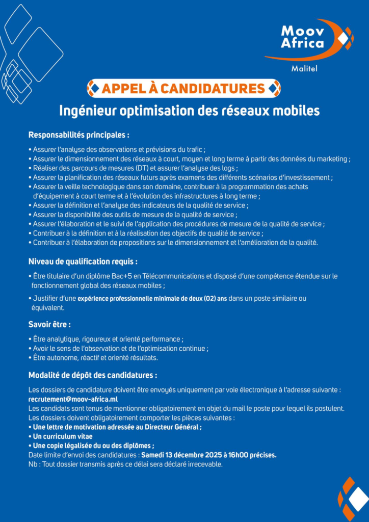 MOOV AFRICA MALITEL RECRUTE 13 POSTES H/F
