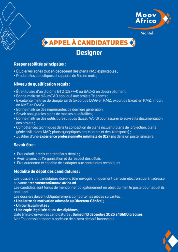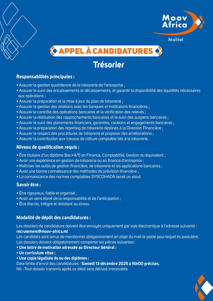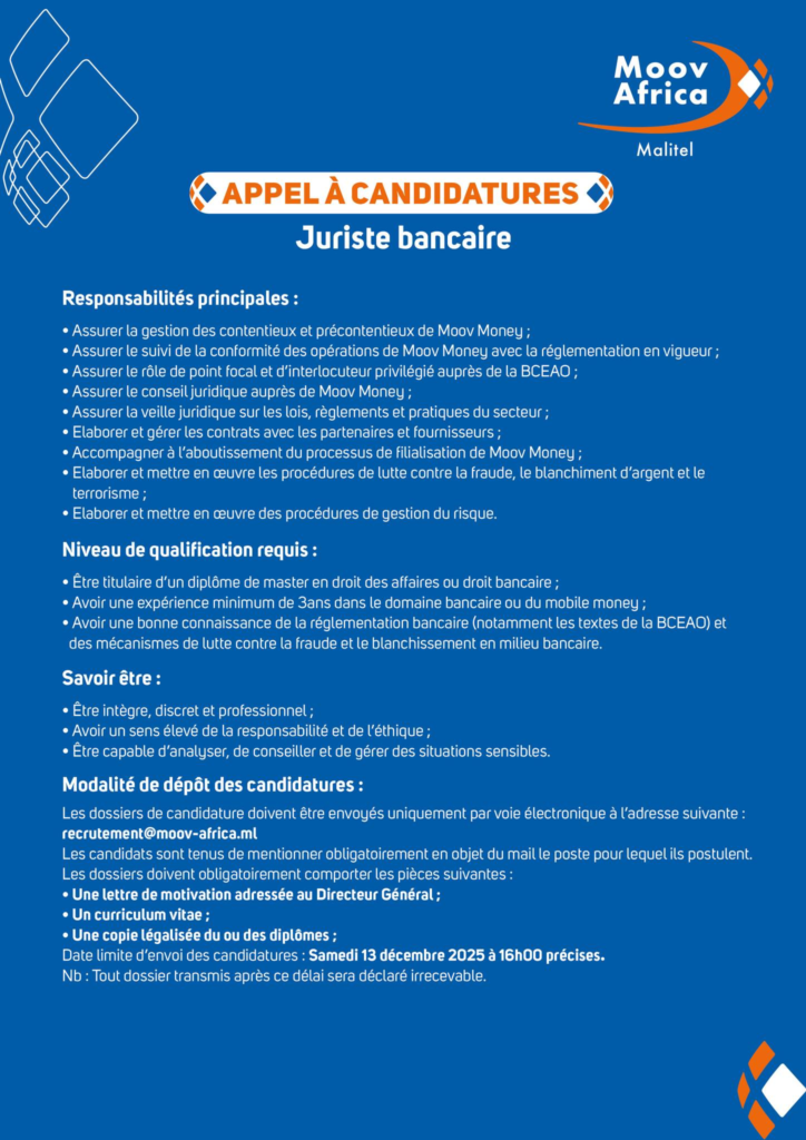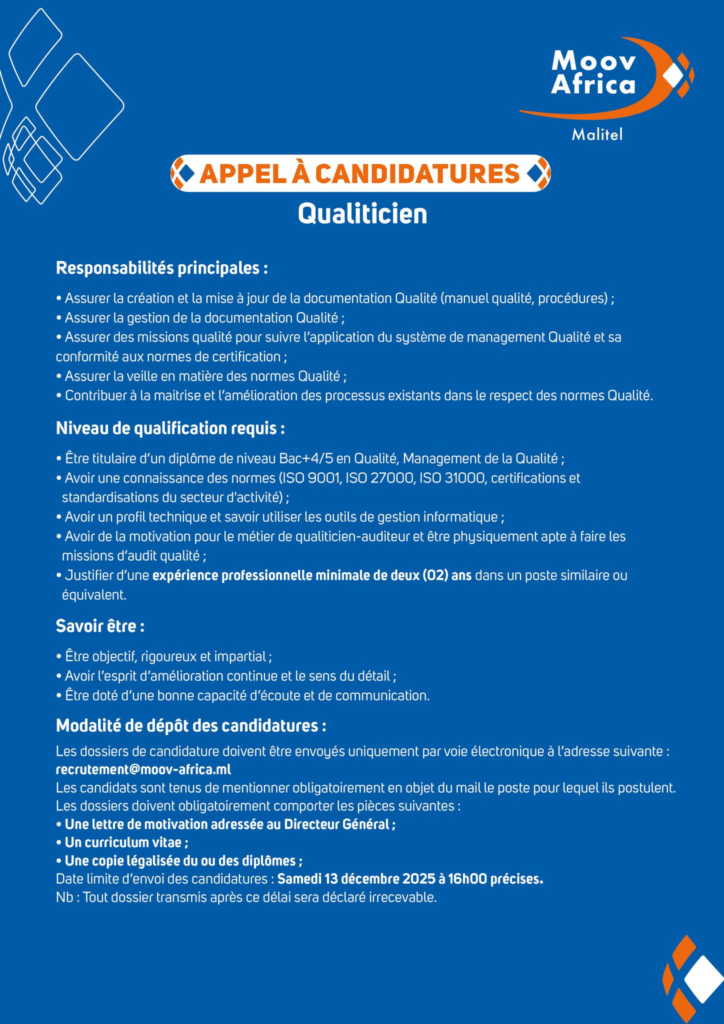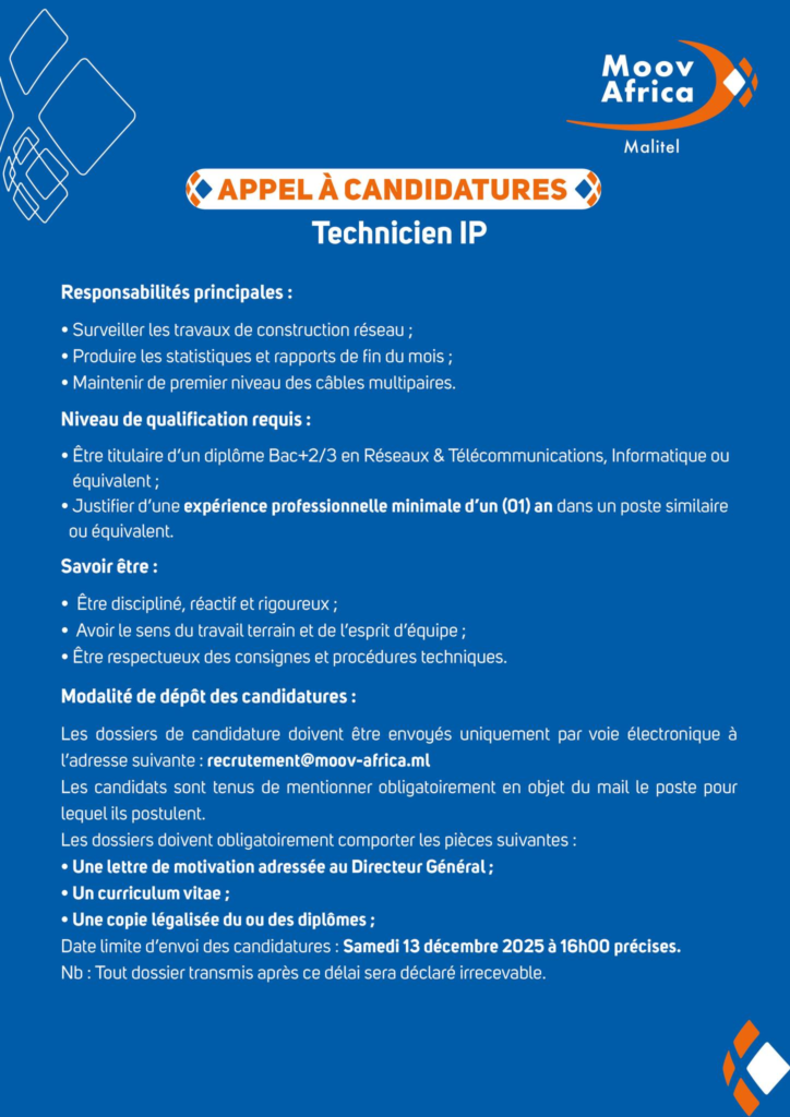 MOOV AFRICA MALITEL RECRUTE 13 POSTES H/F
