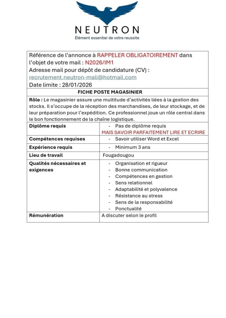 Adresse mail pour dépôt de candidature (CV) : recrutement.neutron-mali@hotmail.com