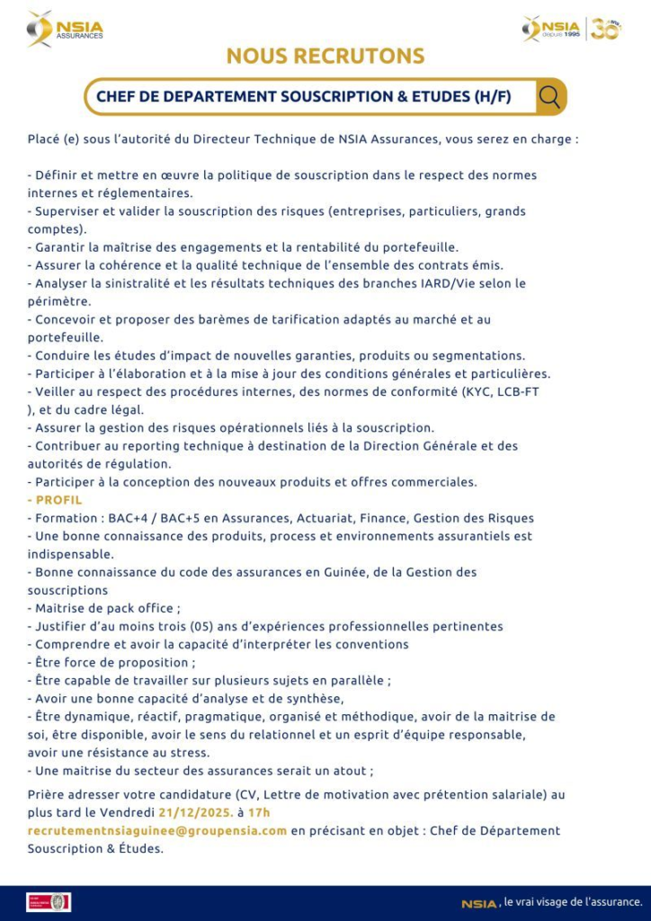 NSIA ASSURANCES GUINEE RECRUTE CHEF DE DEPARTEMENT SOSUCRIPTION ET ETUDES H/F