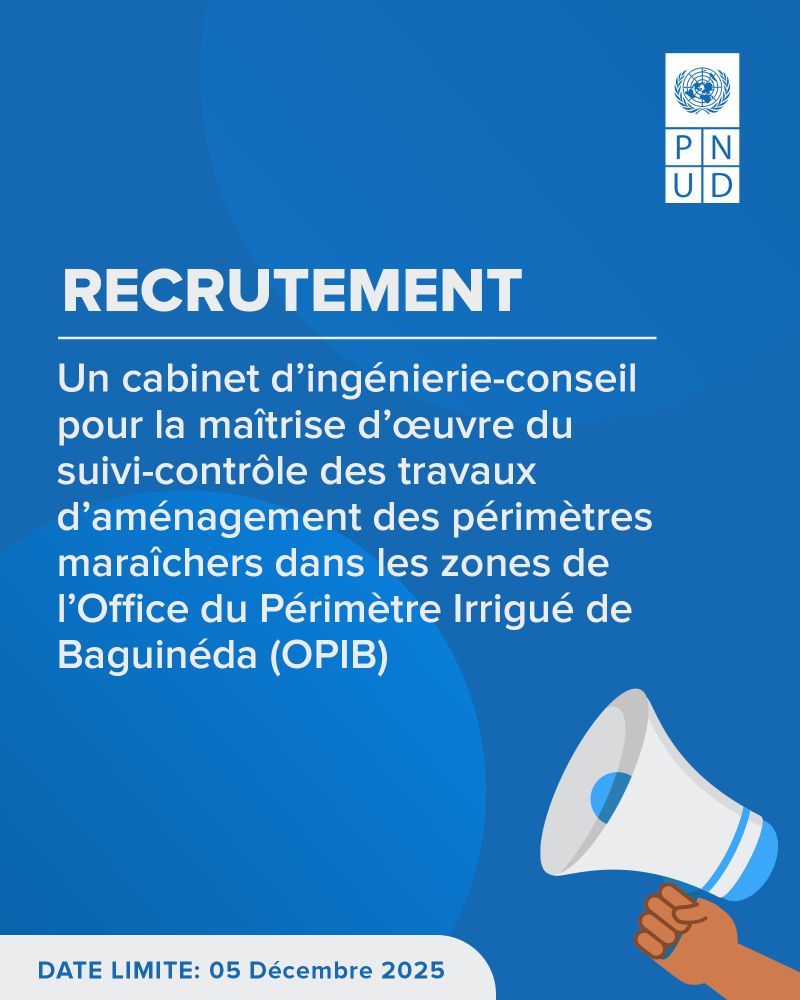 Le PNUD Mali recrute un cabinet d’ingénierie-conseil pour la maîtrise d’œuvre du suivi-contrôle des travaux d’aménagement des périmètres maraîchers dans les zones de l’Office du Périmètre Irrigué de Baguinéda (OPIB).