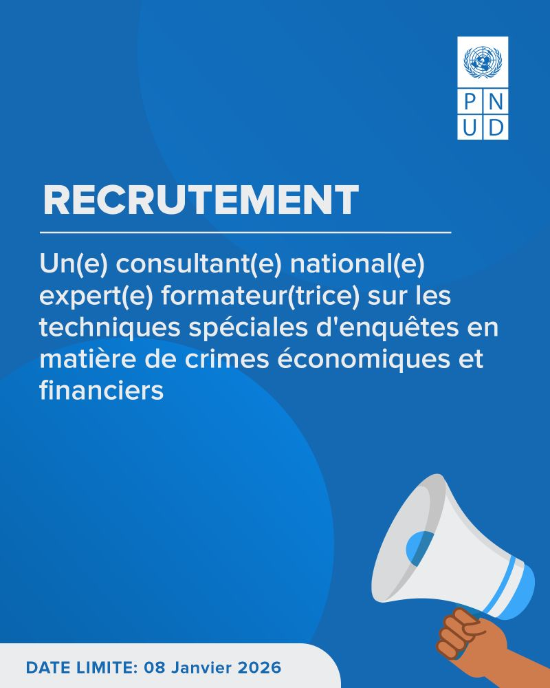 Le PNUD Mali recrute un(e) consultant(e) national(e) expert(e) formateur(trice) sur les techniques spĂ©ciales d’enquĂŞtes en matière de crimes Ă©conomiques et financiers.