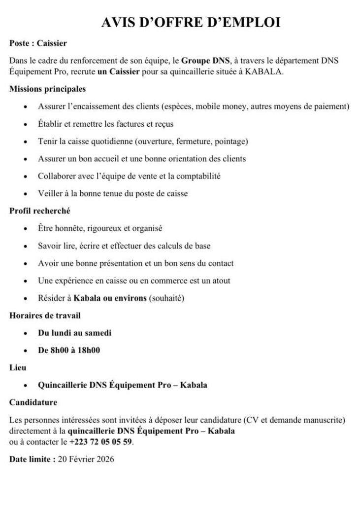 Équipement Pro, recrute un Caissier pour sa quincaillerie située à KABALA.