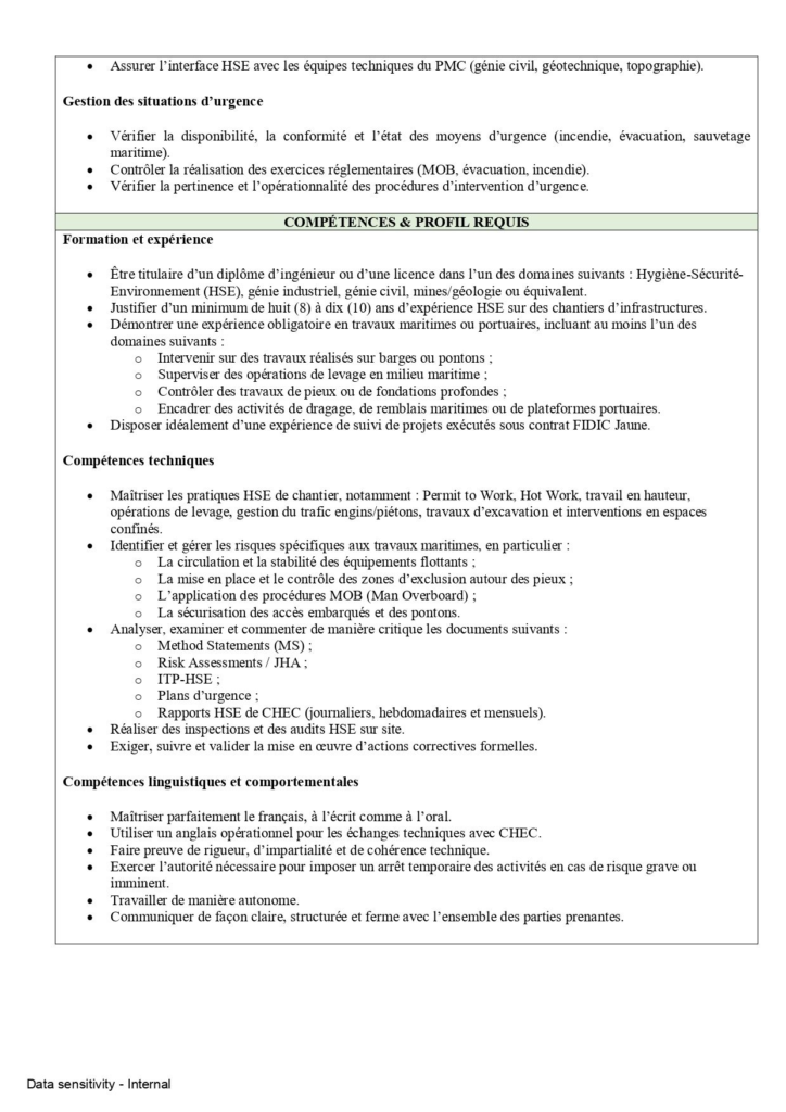 Justifier d’un minimum de huit (8) Ă dix (10) ans d’expĂ©rience HSE sur des chantiers d’infrastructures.