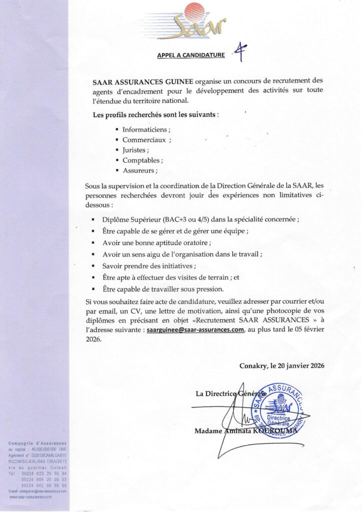 l’adresse suivante : saarguinee@saar-assurances.com, au plus tard le 05 février 2026