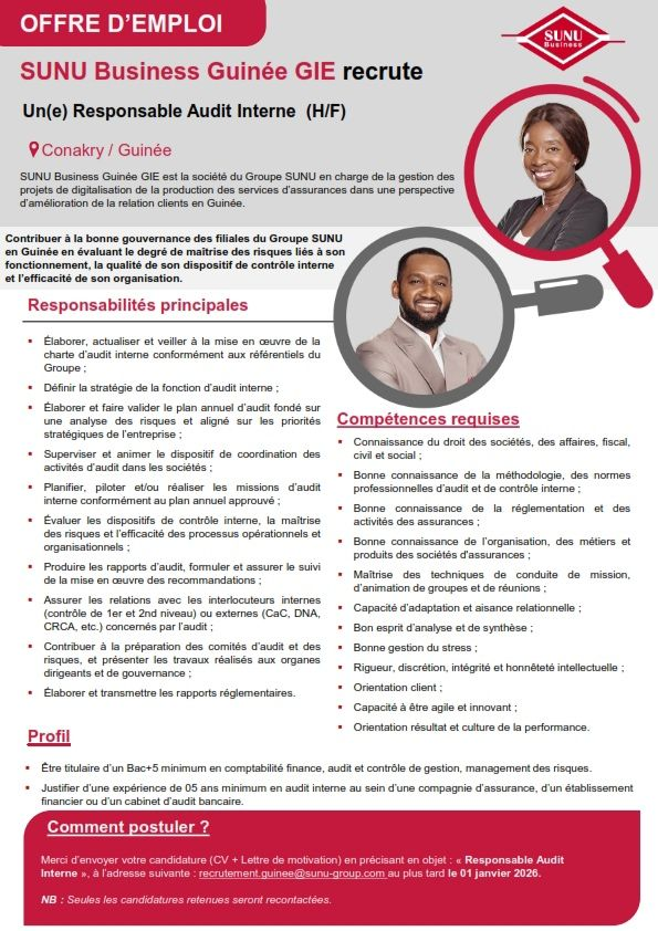 Interne », à l’adresse suivante: recrutement.guinee@sunu-group.com au plus tard le 01 janvier 2026.