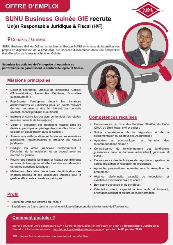 Merci d’envoyer votre candidature (CV + Lettre de motivation) en précisant en objet : « Responsable Juridique & Fiscal », à l’adresse suivante: recrutement.guinee@sunu-group.com au plus tard le 01 janvier 2026.