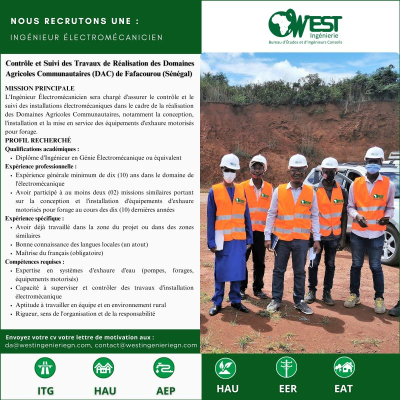 Le Cabinet WEST Ingénierie recrute pour le projet de Contrôle et Suivi des Travaux de Réalisation des Domaines Agricoles Communautaires (DAC) de Fafacourou, région de Kolda, République du Sénégal.